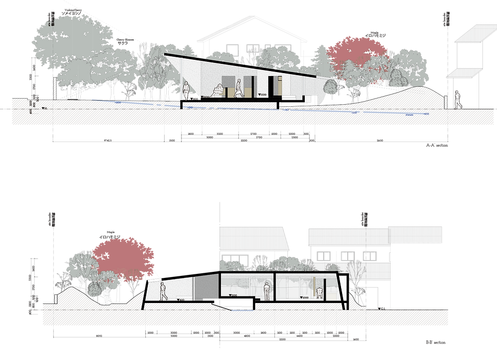 This is the residential project for a private client in the site with a high potential natural environment. The requirements from the client were the ambient surrounded by the trees and the hidden space from people’s eye sights to enjoy music and books by himself. The project has been developed in the reversed way from usual design process which initiated with the landscape design by taking advantage of the existing trees. Subsequently, the architectural design was created in response to landscape. The privacy is indirectly protected by landscape and the architecture secondarily performs as a blinder. Therefore, the sense of nature is optimised in the house and it also meets clients’ demand.